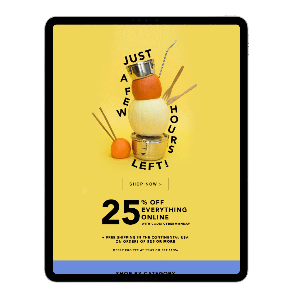 As Creative Lead at Package Free Shop, I was challenged with creating an eye-catching campaign to help us stand out in the crowd during the holiday Black Friday and Cyber Monday shopping season, while also maintaining our ethos of encouraging our consumers to reduce their personal waste and consumption.